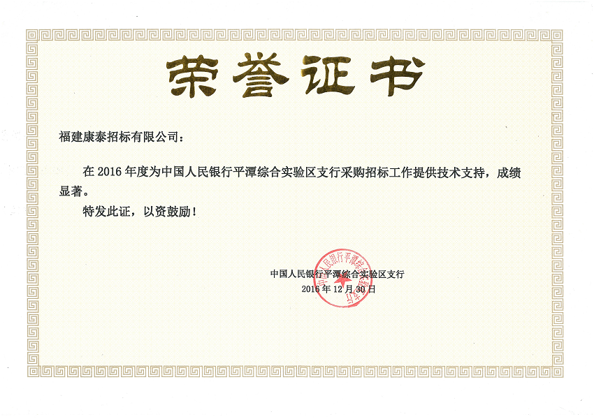中國銀行平潭綜合實(shí)驗(yàn)區(qū)支行授權(quán)榮譽(yù)證書