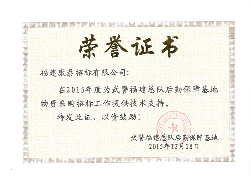 武警福建總隊(duì)后勤保障基地授權(quán)榮譽(yù)證書